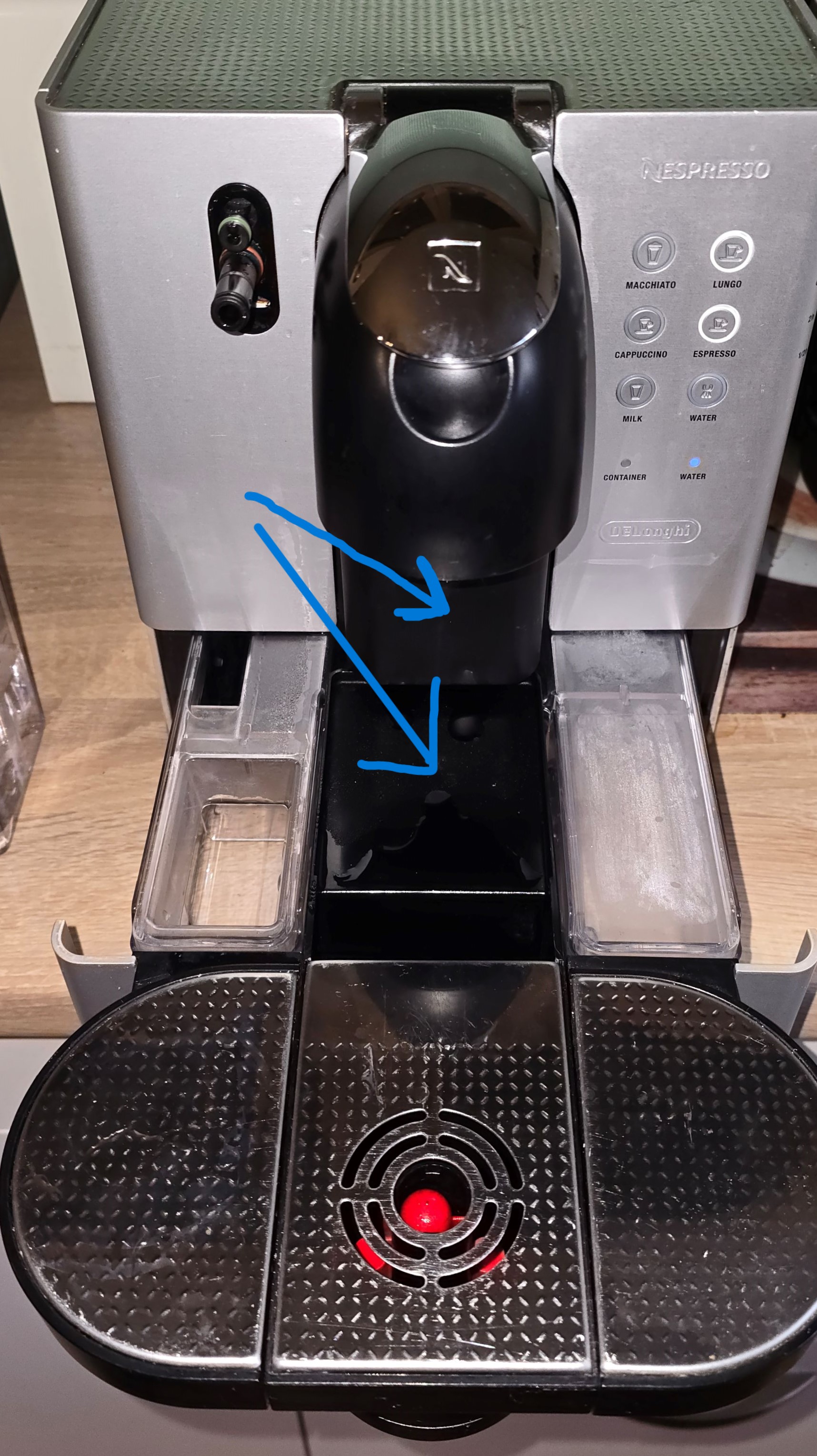 • Die allermeiste Zeit, wenn zu wenig Wasser durch die Kapsel fließt und als Kaffee in der Tasse landet, sondern zu viel Wasser im Kapselauffangbehälter landet, ist der Grund, dass der reguläre Weg "verstopft" ist durch Verkalkung oder meist durch festgetrocknete Kaffeereste.