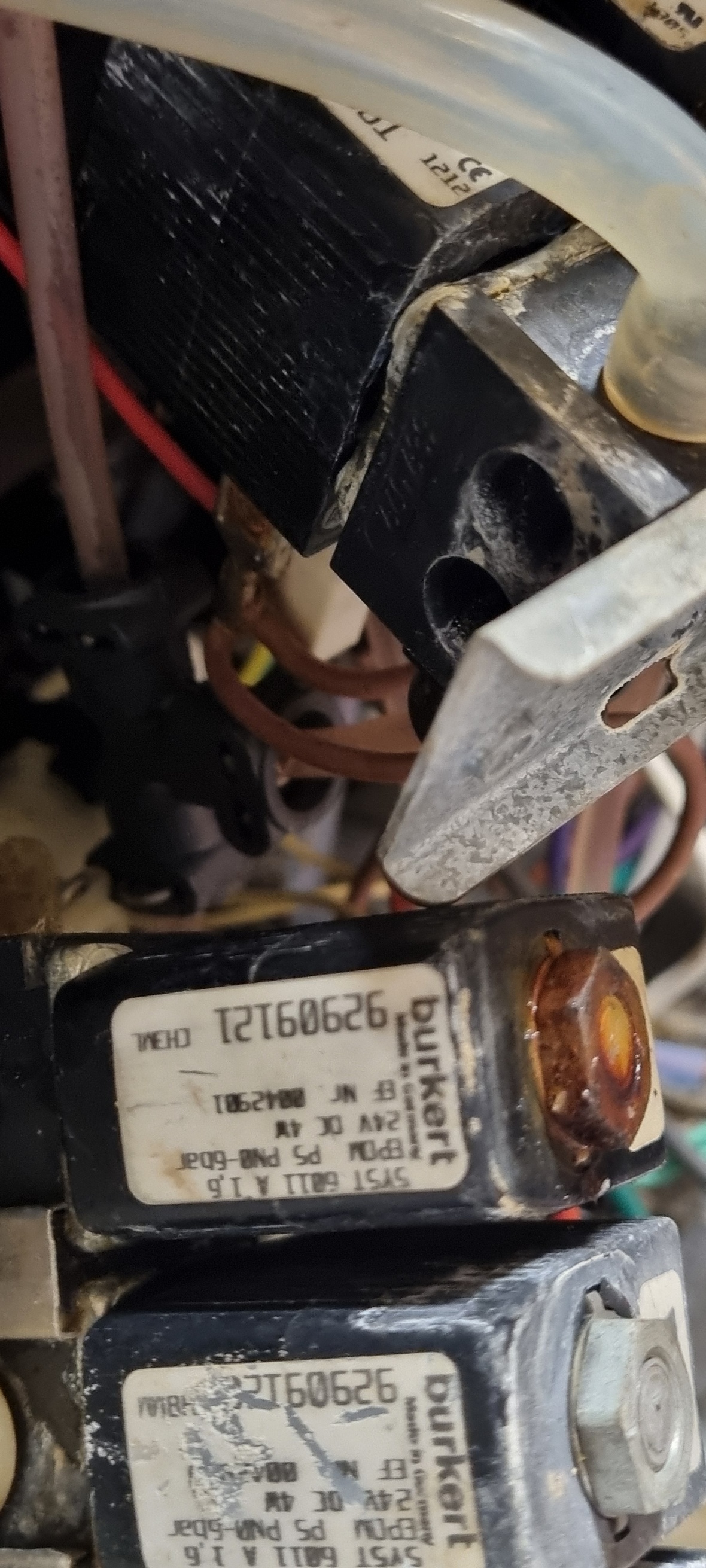 Ich hatte die Mutter lösen können und das Schwarze Plastik nach oben abziehen können. Zwischen dem Plastik und dem Ventil war / ist eine O-Ring, etwa 6mm Durchmesser. Meine Suche nach Dichtung & Burkert war erfolglos. Ich warte noch auf den Teileträger. Soll laut DHL heute kommen.