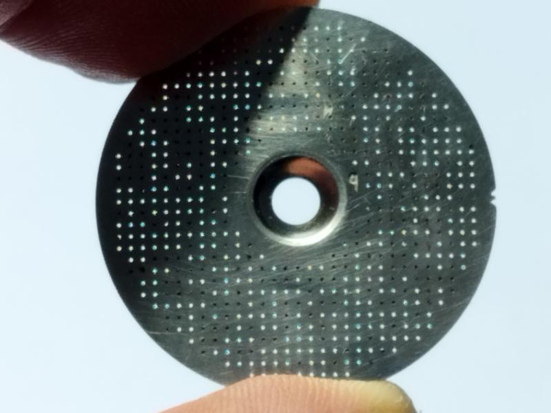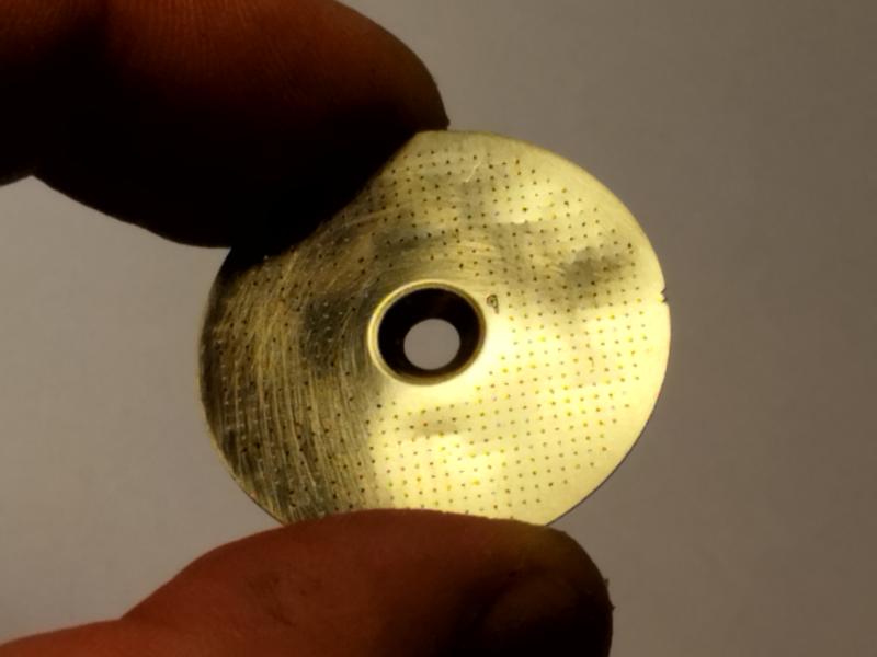 Was vermutlich in ein paar Wochen wiederkehrt, wird das Problem des verstopfenden Cremaventils sein. Wobei ich noch gar nicht so sicher bin, dass wirklich der Ventilkolben selbst festklemmt, sondern eher, dass Kaffeemehl sich irgendwie durch das Brühsieb oder daran vorbei schummelt, sich im Zwischenraum zwischen Brühsieb und Cremaventil zu einem Klumpen verdichtet und dann den Zufluss zum Crema-Ventil vor der kleinen Bohrung verstopft. Oder so ähnlich. So richtig gefunden habe ich da nichts, aber das hat ja noch nicht viel zu sagen. Was ich fand, so wie jedes Mal, wenn ich das Brühsieb ausbaue, waren reichlich verstopfte Löcher des Brühsiebes. Hier habe ich die meisten schon mit einer Nadel wieder aufgestochen, daher sieht das hier noch relativ human aus: