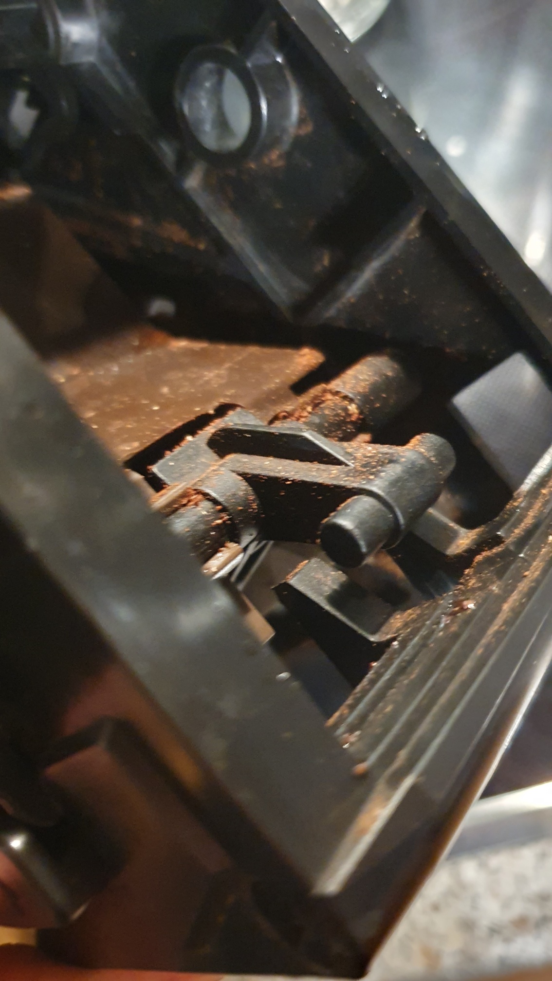 Allerdings liegt immer wieder hinter der Brühgruppe gemahlener trockener Kaffe, also wenn man in die Seitenklappe abmacht rechts von der Brühgruppe.