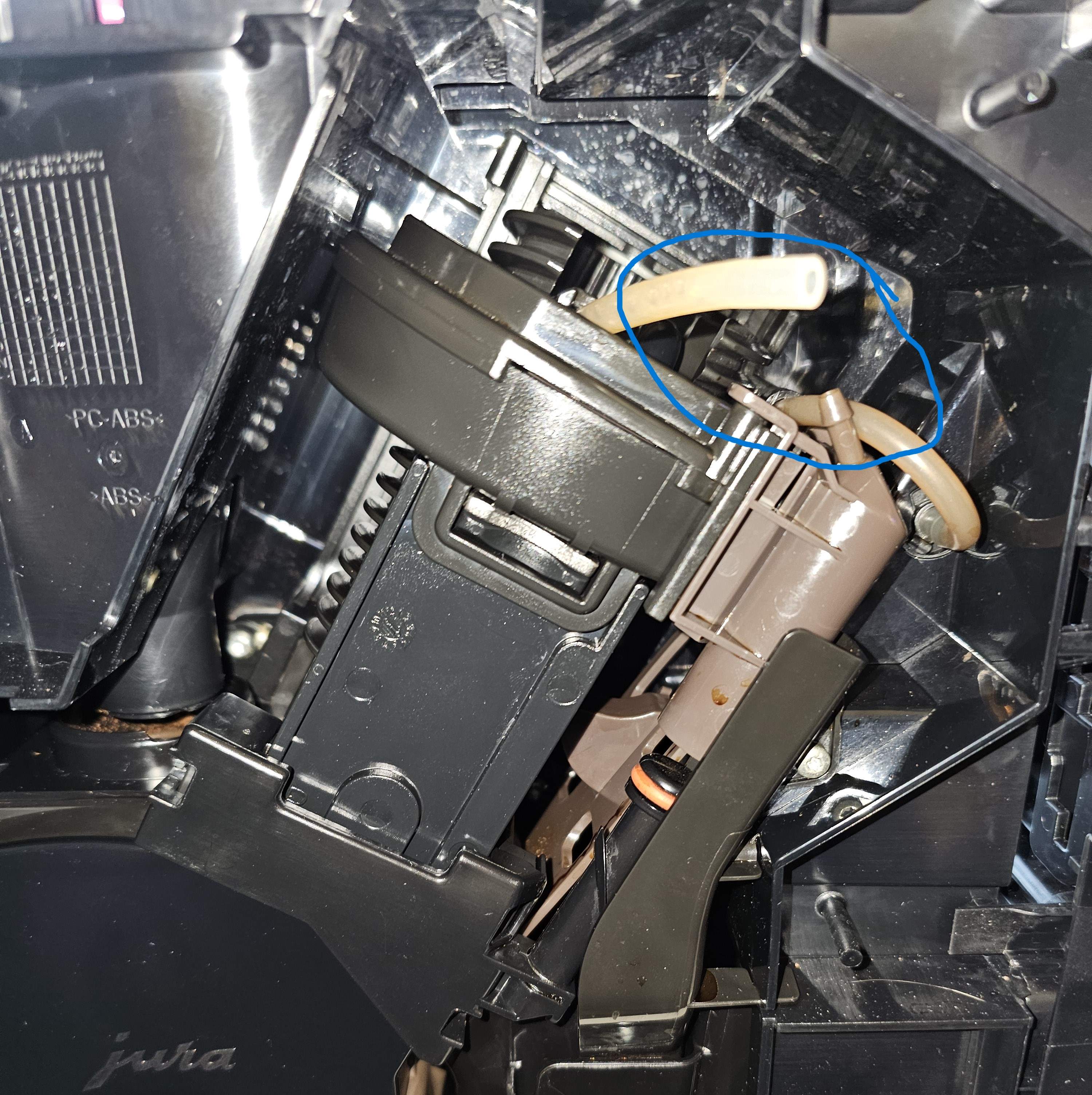 Das Steigrohr in der Maschine ist 2-geteilt. Unten sitzt das Crema-Ventil, dann kommt ein kleines Y-stück aus dem der Schlauch für Kaffee richtung Auslauf abzweigt.