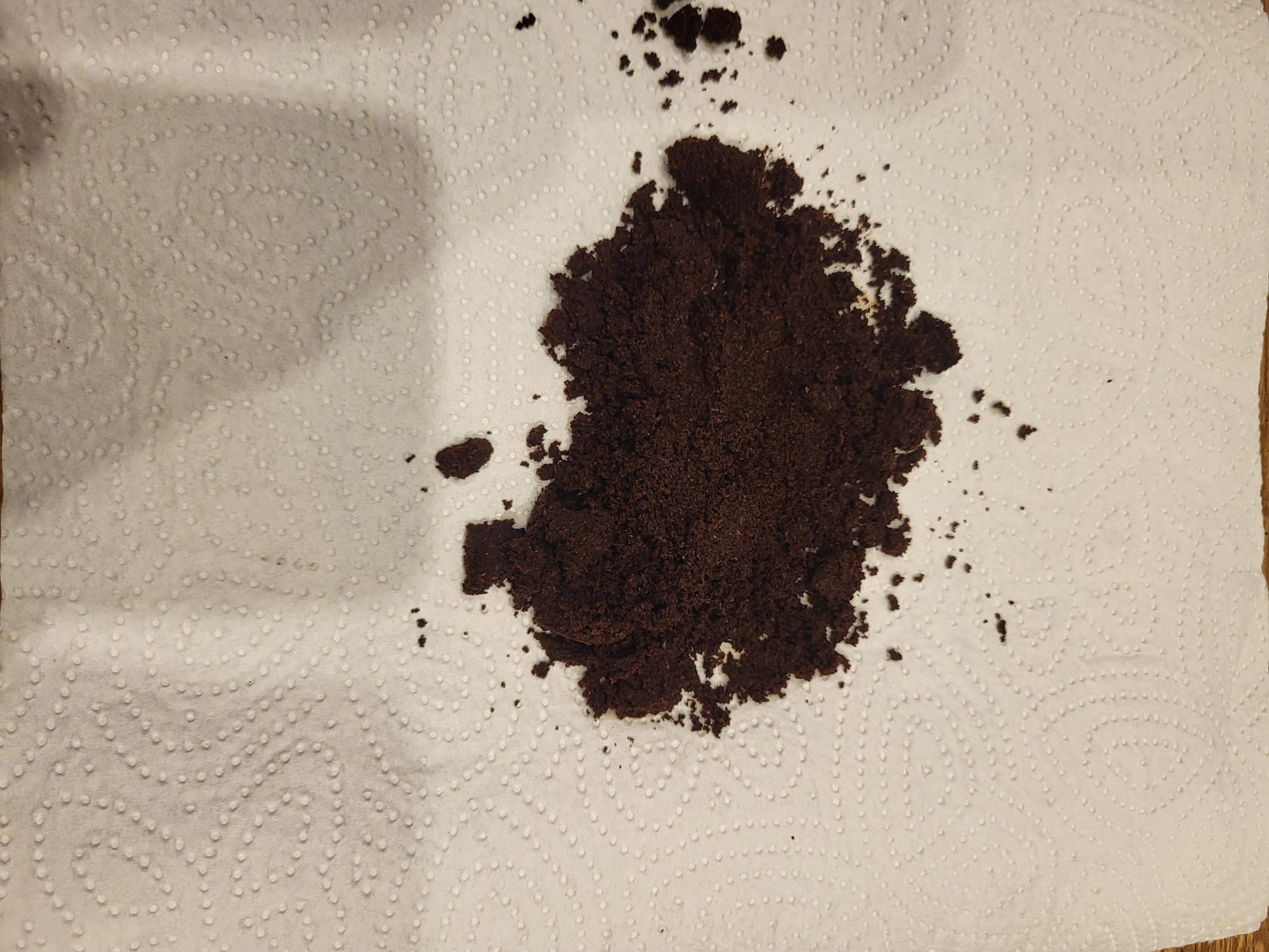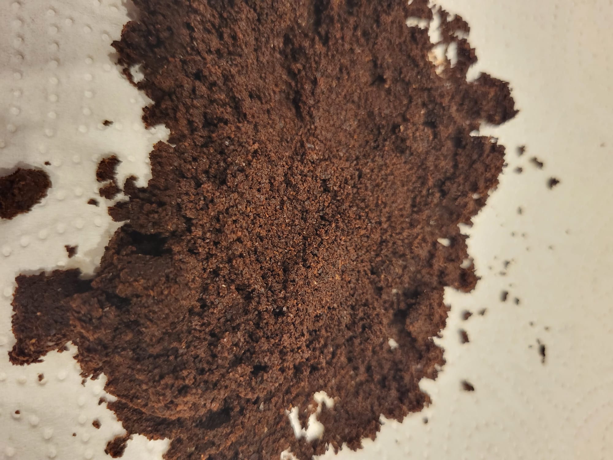 Nur um sicher zu gehen, dass ich es auch wirklich richtig gemacht habe. Ich habe das Mahlwerk bis zum Anschlag zugedreht und dann etwa 7 "Klicks" zurückgedreht. An die 7 habe ich mich etwas herangetastet. Auf dem angehangenen Foto sieht man, wie sich der Mahlgrad des Kaffeesatzes etwas verfeinert hat. Links vorher, rechts nachher. Der Trester liegt nun auch als Brikett im Behälter. Allerdings wirkt er noch feucht.