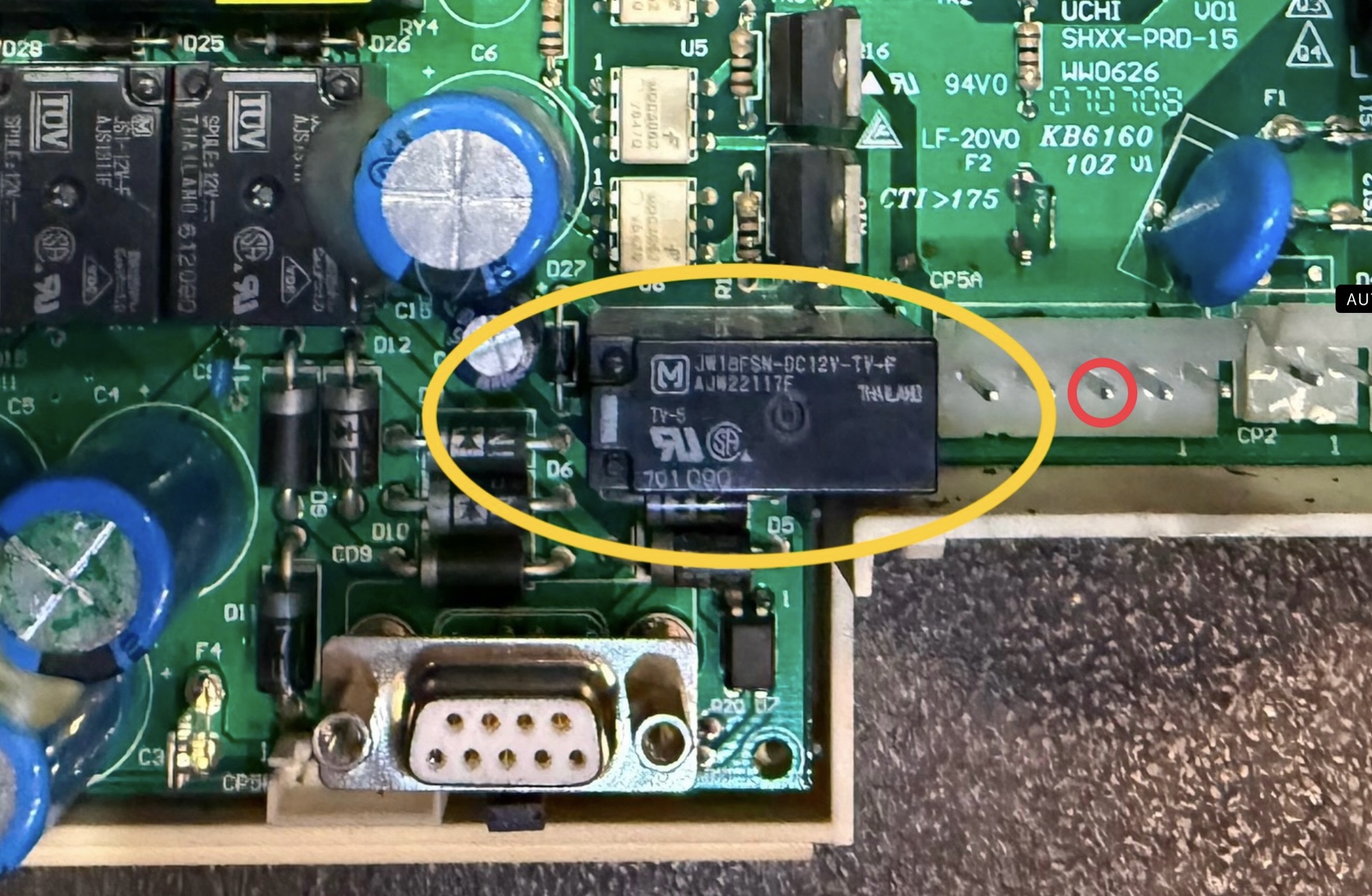Hab aber das Relais gefunden. Das schwarze Kabel des Magnetschalters geht auf den mittleren Pin (roter Kreis) und von da geht es in das Relais direkt daneben (gelber Kreis).