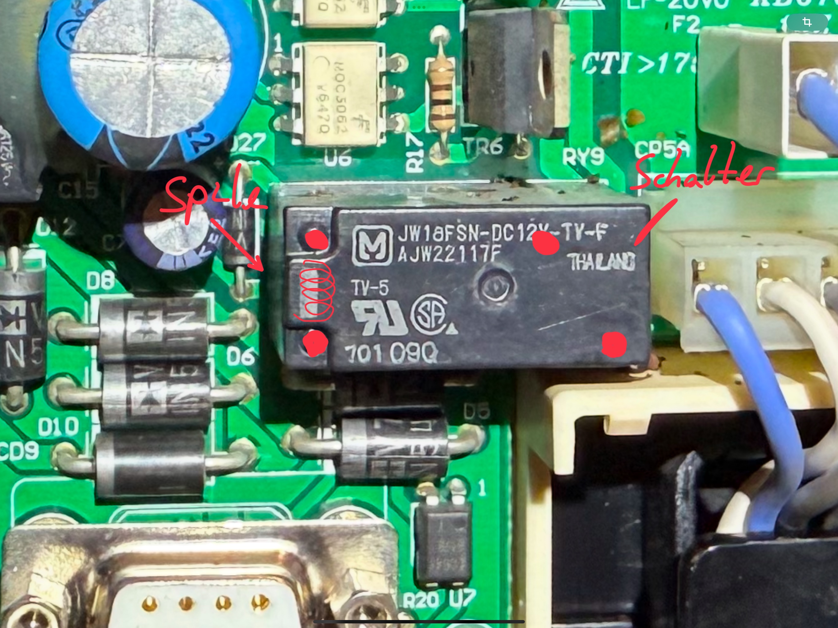 • Es gibt keine Schaltpläne, das kann/muss man so herausfinden. Vielleicht misst man von der Spule zur Platine, markiert den Pin und misst weiter zum Relais? Ich habe davon keine Platine mehr liegen, das musst du selber herausfinden. Es wird eins von den länglichen Relais sein. Netzfilter ist nicht gleich Kondensator, der beinhaltet auch noch eine Spule.