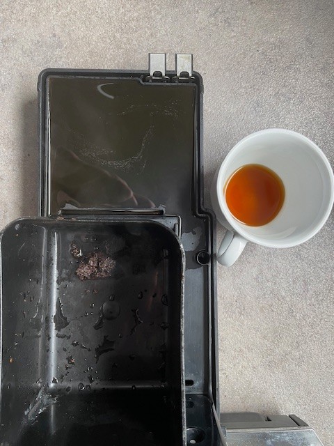 Hier mal ein Foto, wie es aussieht. Die Bezugsmenge sollte eigentlich einer vollen Tasse entsprechen. Merkwürdig ist auch, wie wenig Pulver im Tresterbehälter gelandet ist (Ok, hier habe ich Mild eingestellt, um nicht so viel Kaffee zu verschwenden). Wo mache ich denn nun am besten weiter?
