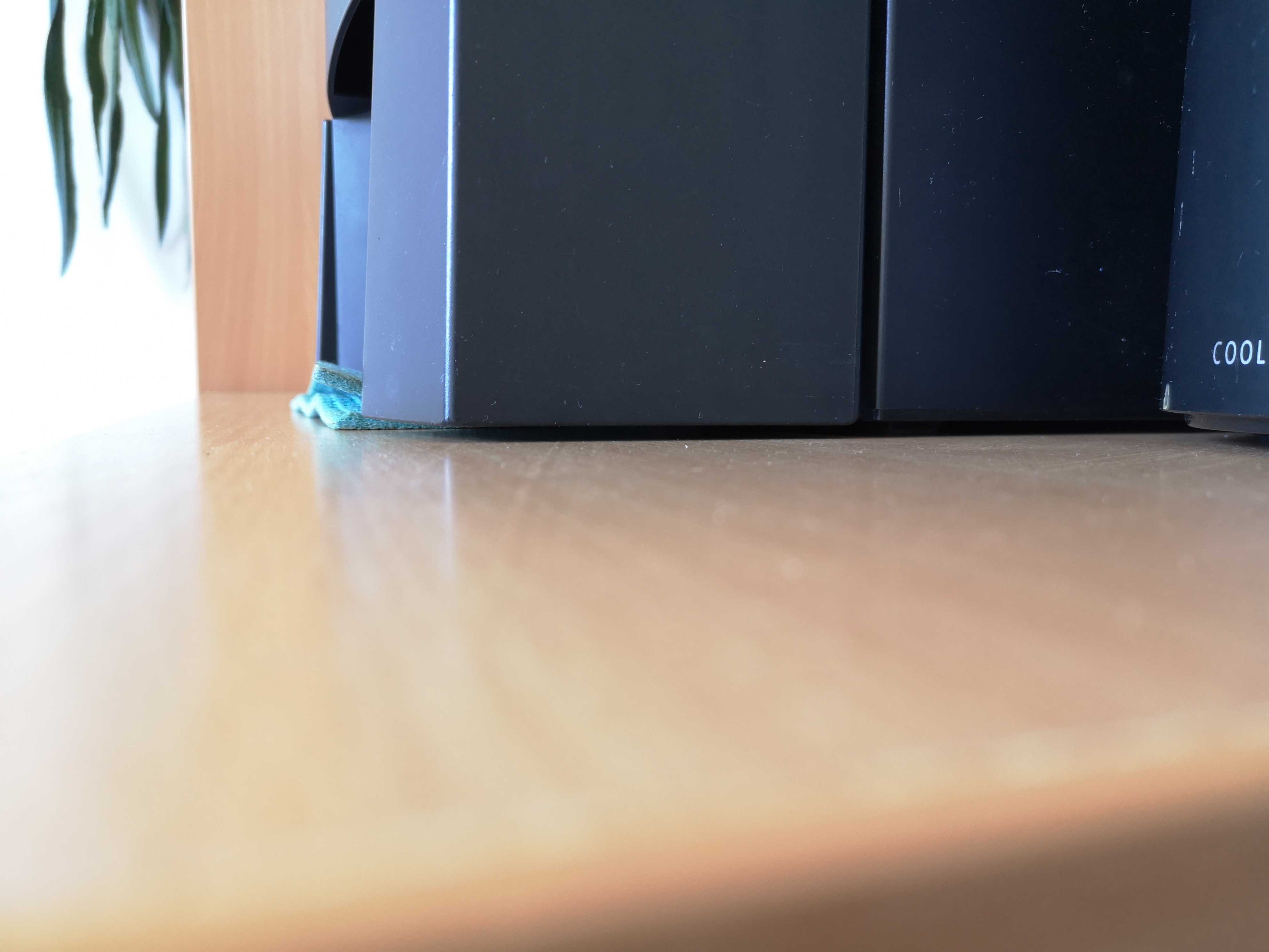 Leider löst sich die Abtropfschale viel zu leicht aus ihrer Halterung und dann zeigt die Maschine die übliche Meldung "Schale fehlt". Der Unterbau der Maschine und der untere Rand der Abtropfschale liegen grundsätzlich parallel auf derselben Ebene, aber durch die Gummifüße des Unterbaus hängt die Abtropfschale immer leicht in der Luft. Dem Anschein nach ist das normal so, das kann man beim Wissen um diesen Umstand auch auf Fotos erkennen.