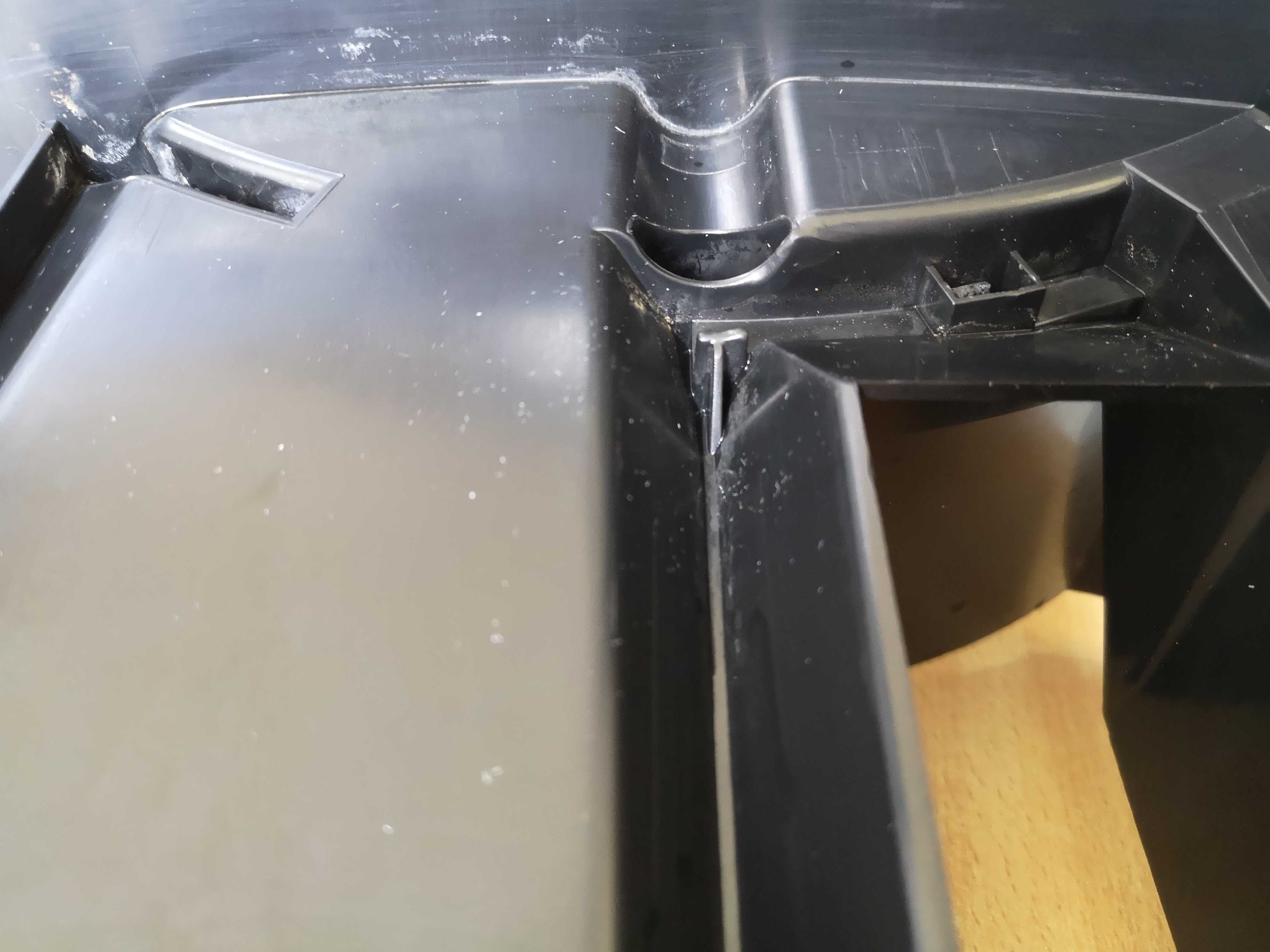 Auf dem ersten Foto sieht man den Wischlappen, den ich als Rutschbremse untergelegt habe. Nicht schön, aber funktioniert. Auf dem zweiten Foto sieht man die Zunge mit dem Pin am Ende, der die Abtropfschale festhalten soll. Die Zunge ist schon wieder weiter nach unten gedrückt, aber es hatte nichts geholfen, sie nach oben zu biegen. Das letzte Foto zeigt die Mitte der Unterseite der Abtropfschale. Da greift der Pin aus Bild zwei ein und sollte die Schale festhalten.