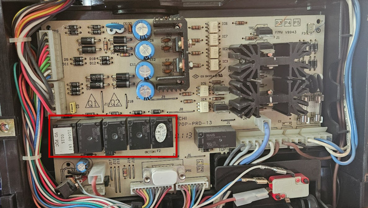 To replace the relays wasn't that difficult. The board is just held by two screws and few tie straps. Be careful when removing the relays so you don't damage the pads on the PCB. A good soldering iron and a manual suction pump will do it. The relay is a Panasonic JSM1-12-5, available at Conrad and other shops.