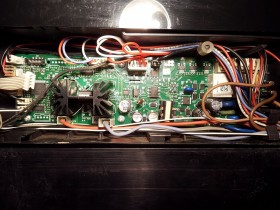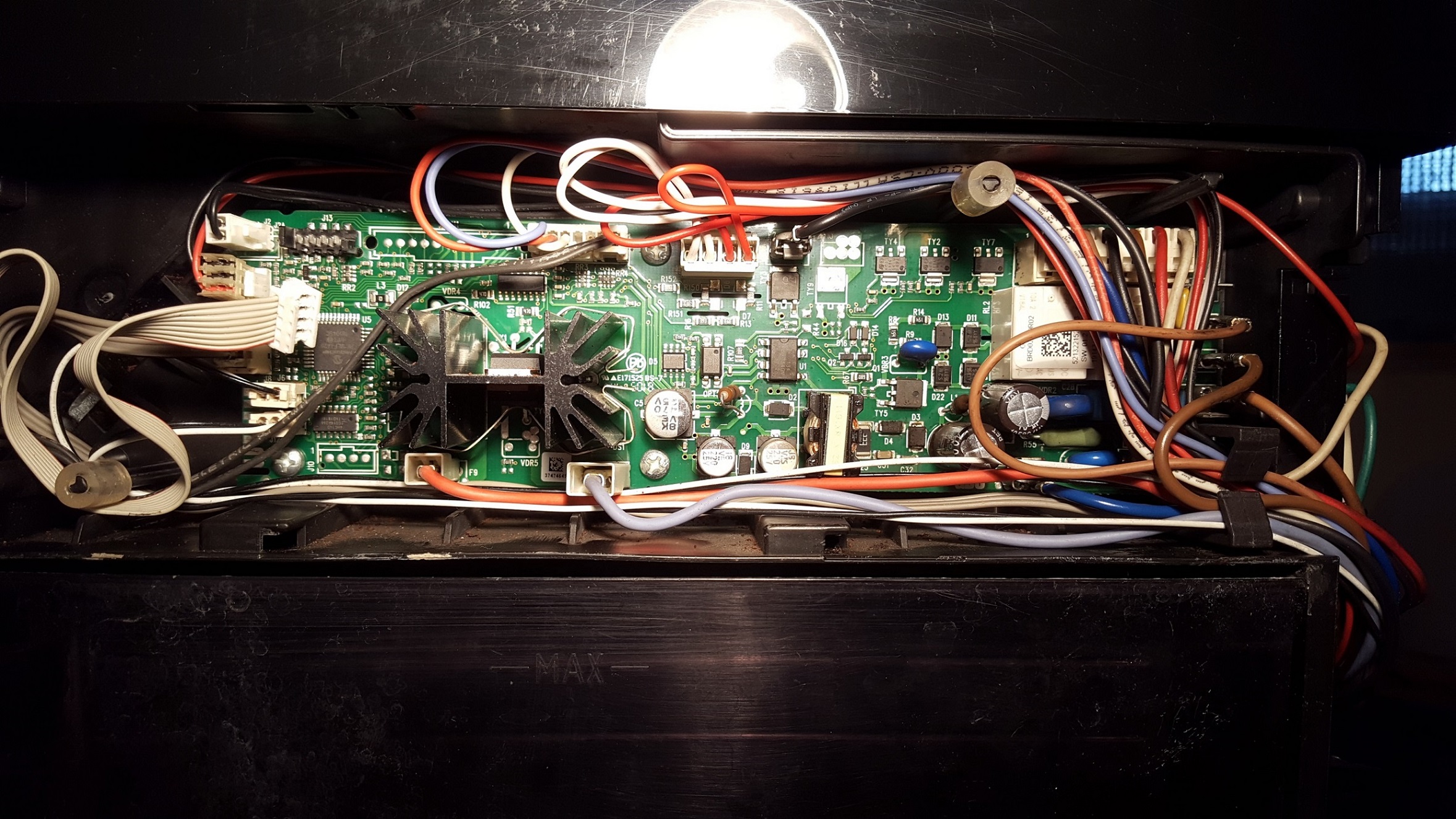 Zum Abnehmen der oberen Verkleidung musste ein gelb-grünes Massekabel und das Flachbandkabel zum vorderen Display ausgesteckt werden. Nach Reinigung der verstopften Leitung und Inbetriebnahme der Maschine erschien auf dem Display die oben genannte Meldung. Es könnte sein, dass ich beim Abstecken des Flachkabels an der Leistungsplatine etwas beschädigt habe, weil der Stecker sich sehr schlecht lösen ließ.