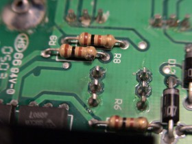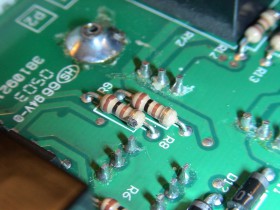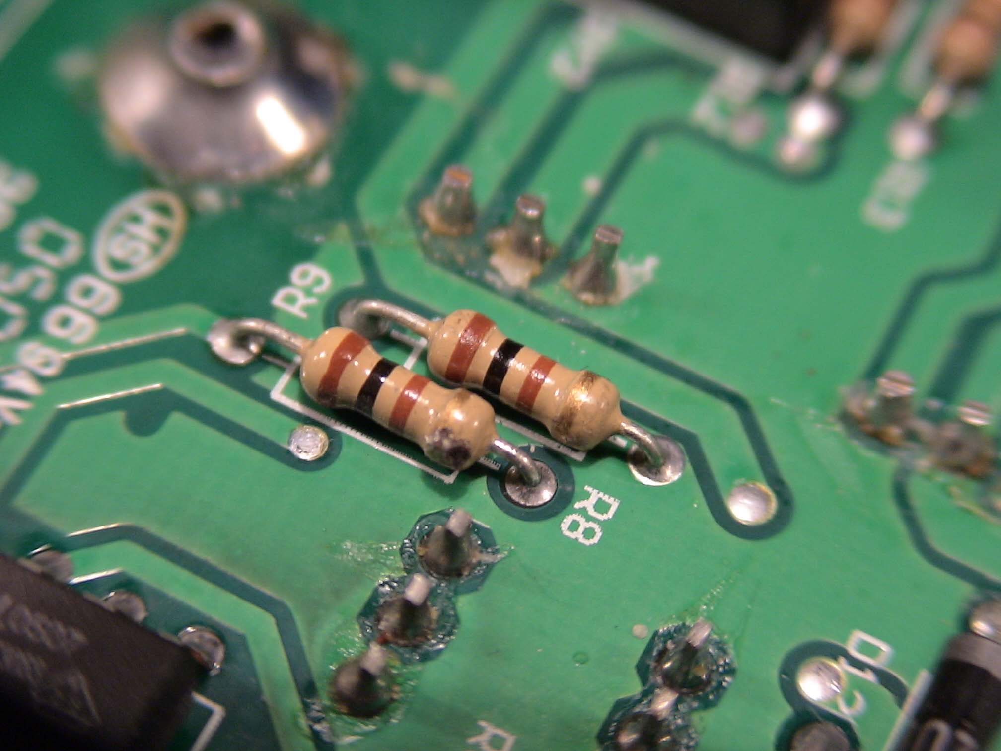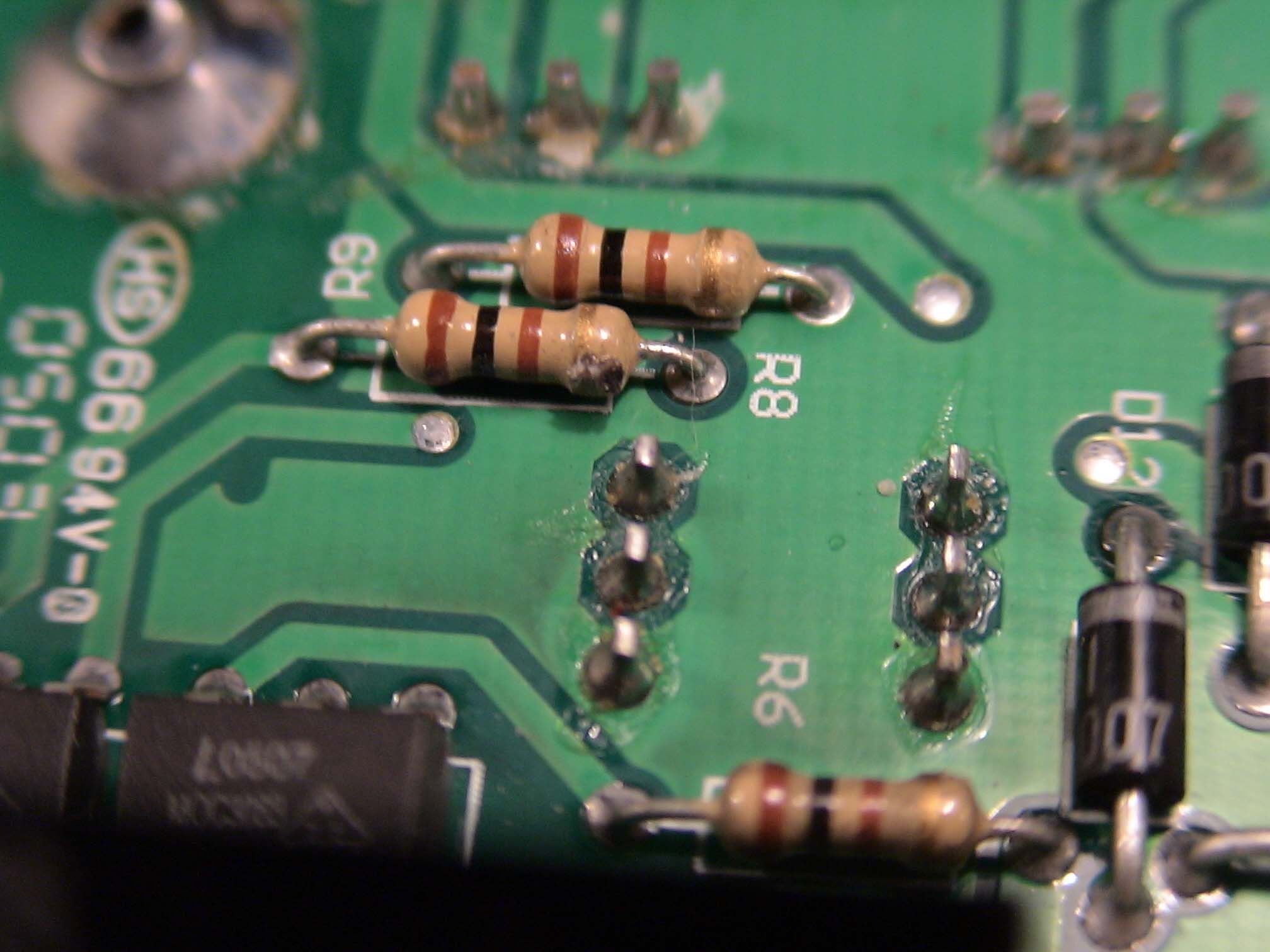 Zu Bild 2 habe ich noch 2 weitere Bilder zum Schluß drangehängt. Wenn Du auf die R6 schaust und dann die 3 links, sieht es so aus als ob es hier etwas schwarz ist, kannst Du das erkennen? Wenn Du die linken von unten zählst, dann sieht es so aus als ob die ersten 2 von unten einen Kreis haben. Vielleicht hat es hier einen Kurzschluß gegeben und somit den Lötzin auf Bild 2 draufgehauen, aber ist von mir als Laien nur eine Vermutung. Was hat R6 für eine Aufgabe?