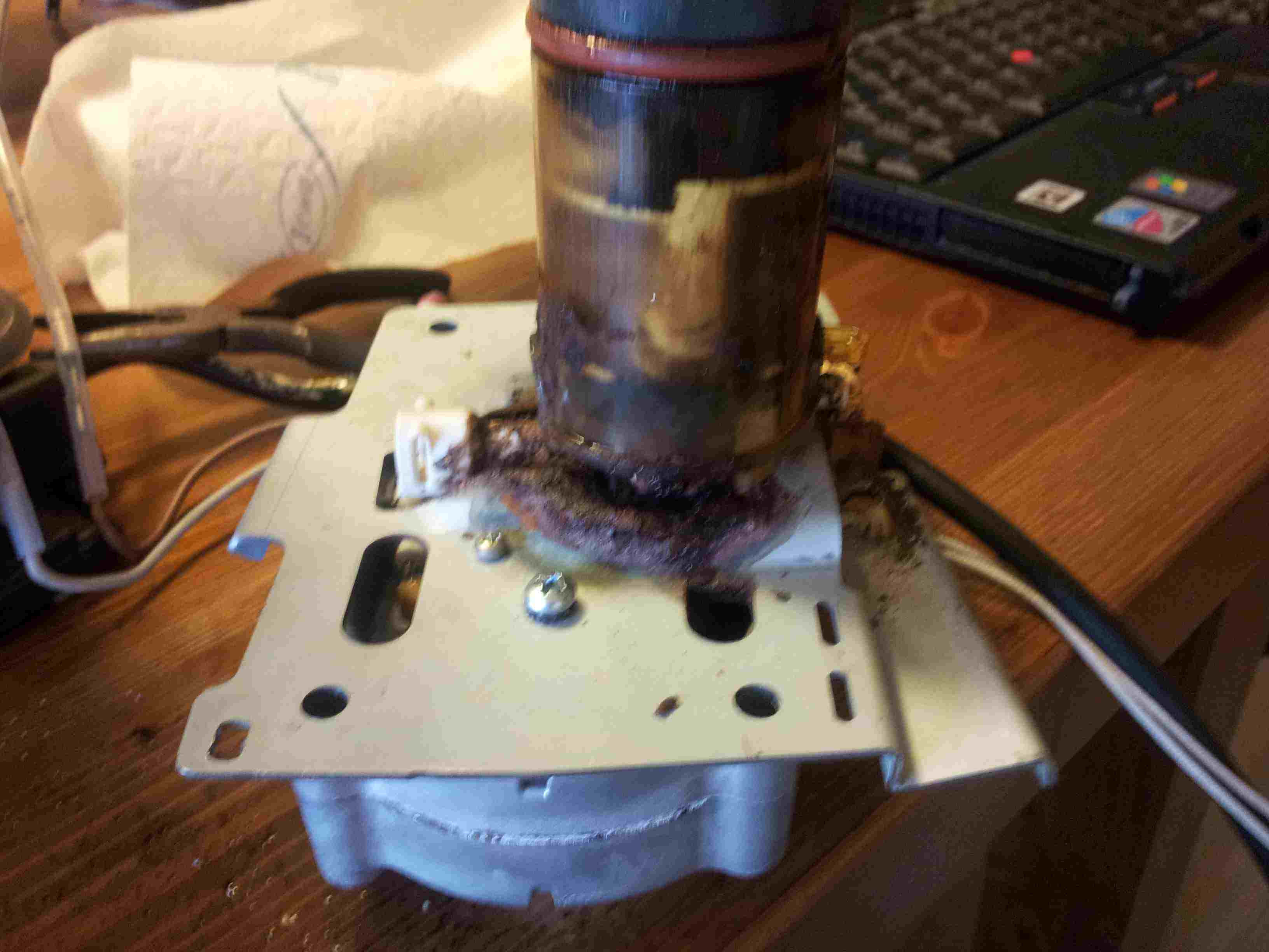 Durch die Verrostung (Wasserverlust am Thermoblock) hat sich der obere Endschalter derart verdrückt, daß der Brühkolben-Noppen ihn nicht mehr erreichte.