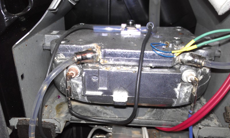 Beim Stromprüfen der Pumpe kam ich schlauerweise mit dem Stromprüfer an das Kabel vom Thermoblock und produzierte einen schönen Kurzschluss. Alles in Allem ne Menge Funken und natürlich ist die Sicherung direkt rausgeflogen. Nun hat sich zum alten Problem dass nur Heisswasser und Dampf bezogen werden kann, jedoch kein Kaffee, das Problem ergeben, dass die Maschine Wasser pumpt sobald man den Stromstecker einsteckt. Dabei kommt das Wasser unten direkt in den Auffangbehälter und läuft und läuft.