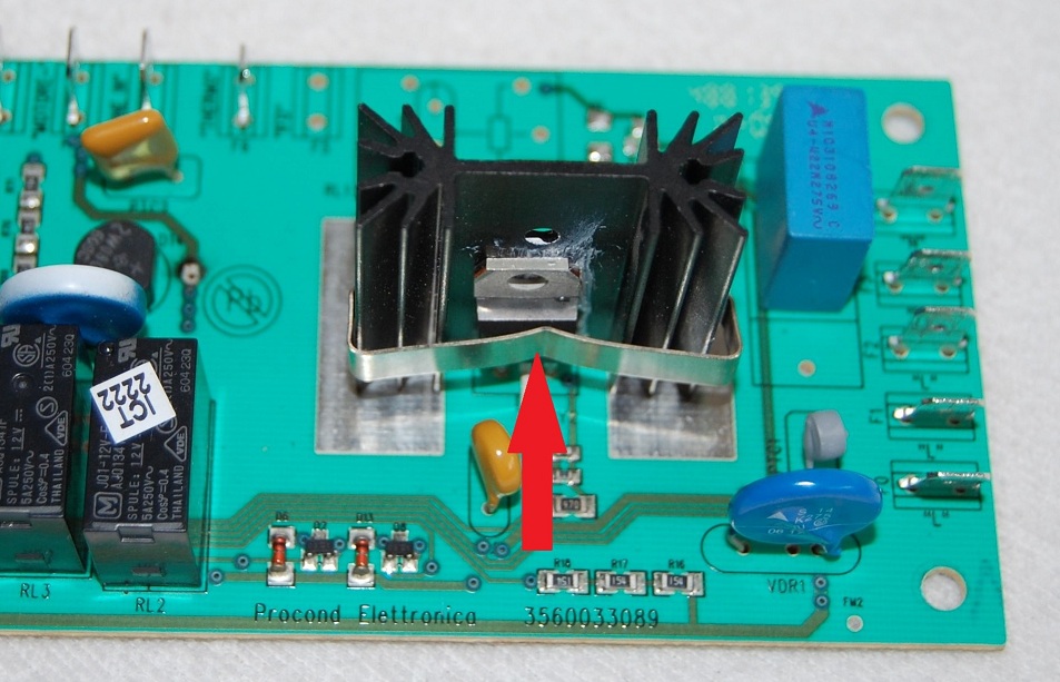 • Schau mal, ob auf der Leistungselektronik ein großer Schwarzer Kühlkörper sitzt, auf dem sich 2 Triacs TY1 und TY2 befinden. Im Bild unten siehst du eine ESAM-Leistungselektronik, dort habe ich den TY2 mit einem roten Pfeil gekennzeichnet.