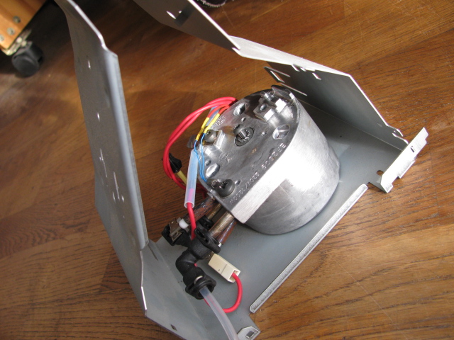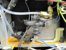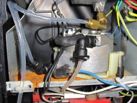 • Man sieht es auf dem Foto nicht richtig. Der Thermoblock ist mit einer längeren Schraube und einem Abstandröhrchen montiert. Seitlichen Abstand kann man auch noch einhalten. Ein passendes Loch muss man selbstverständlich in das Blech bohren. Der JURA Avandgarde S9 Thermoblock sieht fast genauso aus, da ist aber das Problem, daß man die Schläuche nicht direkt anschießen kann. Der Platz für ein Übergangstück ist zu gering.