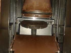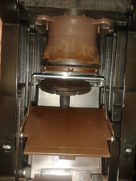 Nach dem Zeitpunkt wo der Kaffee fertig sein sollte, fällt der Kaffee (trocken) nicht in den dafür vorgesehenen Behälter, sonder hinten rechts kurz vor die beiden Kontakte.