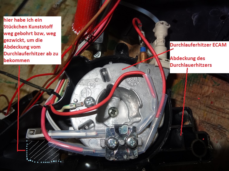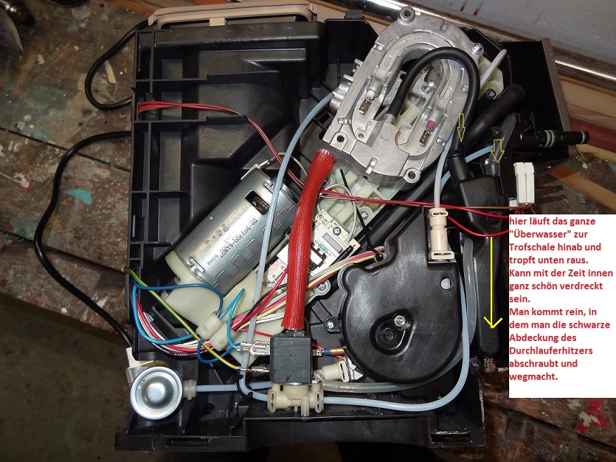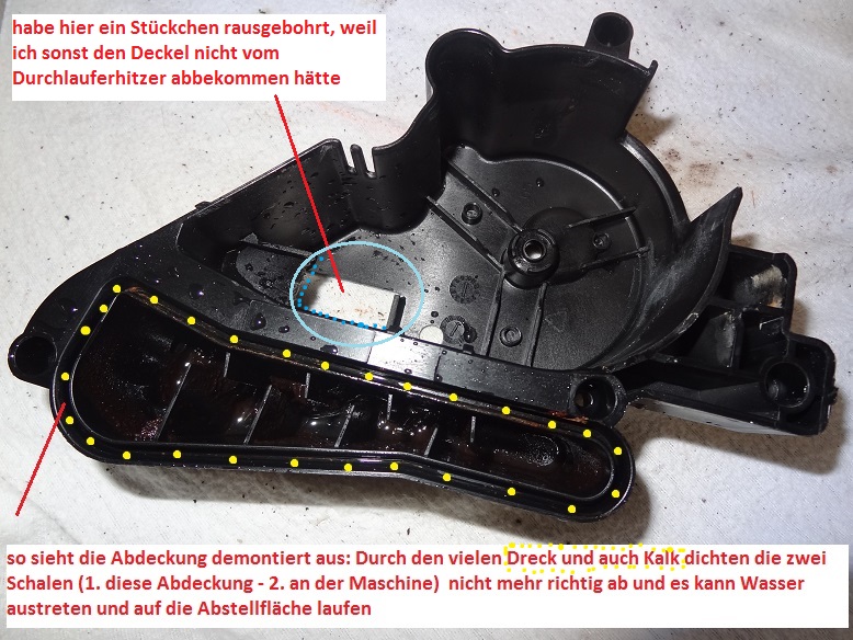 bei einer Reparatur meiner ECAM 23.450S habe ich entdeckt, das der Ablauf des "Überwassers" nach unten in Abtropfschale durch Ablagerungen und Kalk undicht werden kann und so auch Wasser auf die Abstellfläche gelangen kann.