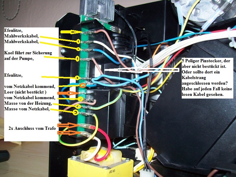 Wer hat fotos darüber oder mag bei seiner mal ein Pic machen, von der Mahlwerksseite wie die Steckerbelegung ist. Unten sind die von den Mikroschalter der Brühgruppe.darüber sind zwei identische Buchsen für die Stecker ,einmal Wasser/Tresterschale Blau/Blau und Rot/Grün für Spannung.