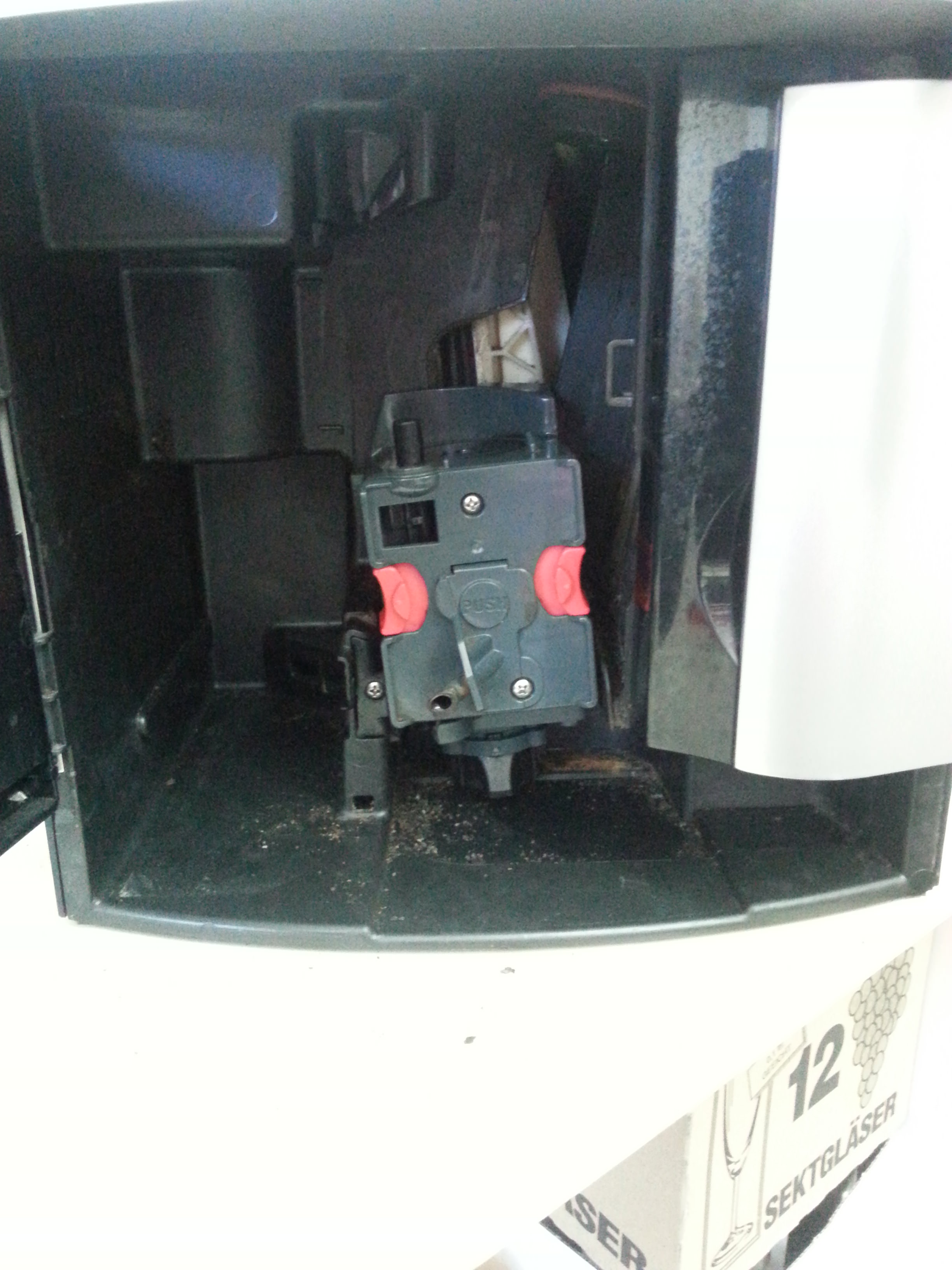 Da wir das ganze jetzt ja offen haben kann man auch sehen, was passiert. Die Maschine fährt die Brüheinheit runter, merkt aber nicht, dass sie unten angekommen ist.