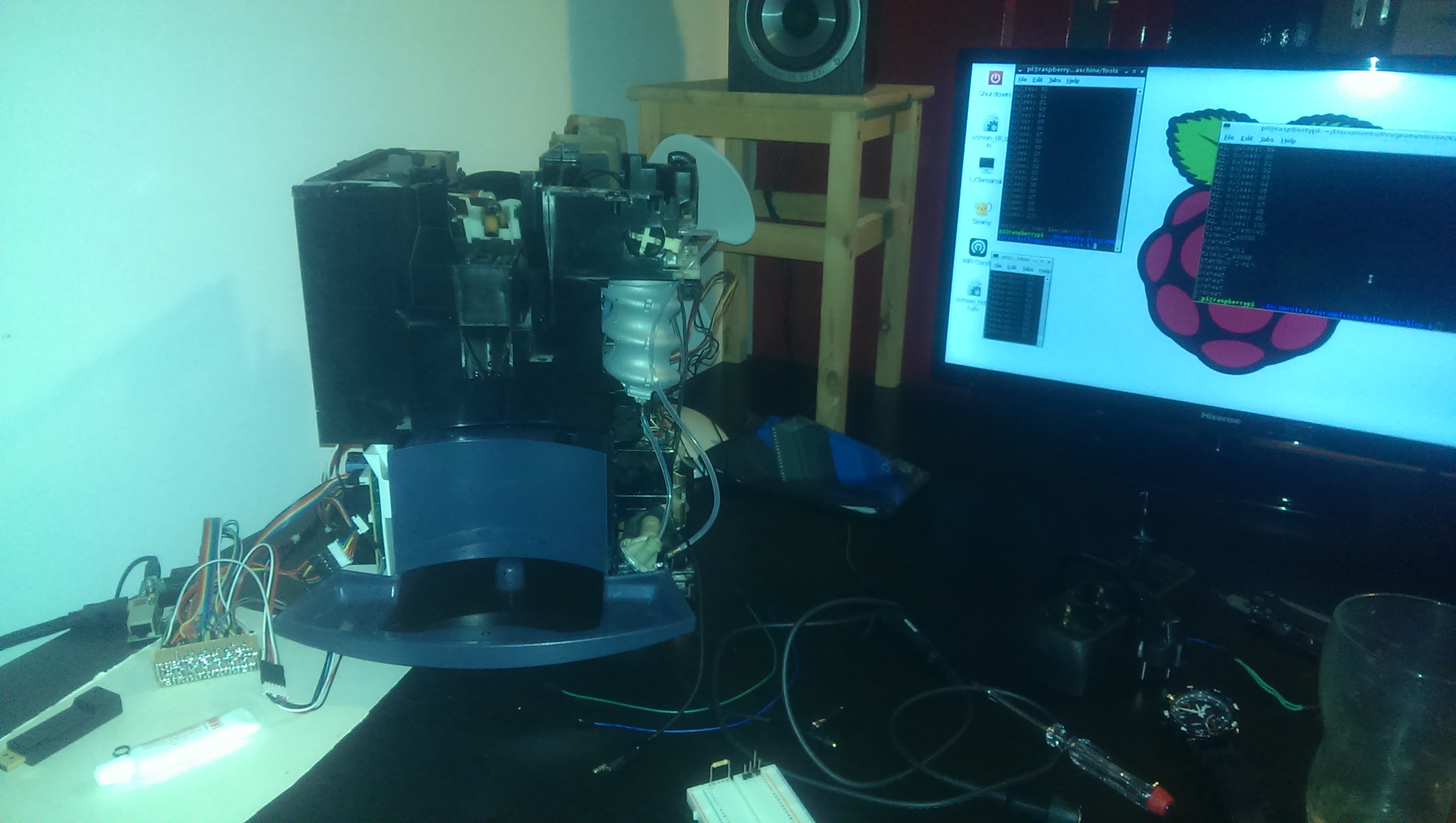 Nachdem meine alte Maschine den Löffel abgegeben hat, habe ich mir als "Einstieg" in die Kaffeevollautomaten eine billige (ehemals defekte) Jura E40 auf eBay gekauft. Die habe ich (mehrmals) zerlegt und mit einem Raspberry Pi statt dem Logikprint mit einigen Extras ausgestattet. So hats nun genaue Einstellmöglichkeiten für die verschiedenen Kaffees, ein Webinterface, Internetradio und einen Touchscreen.
