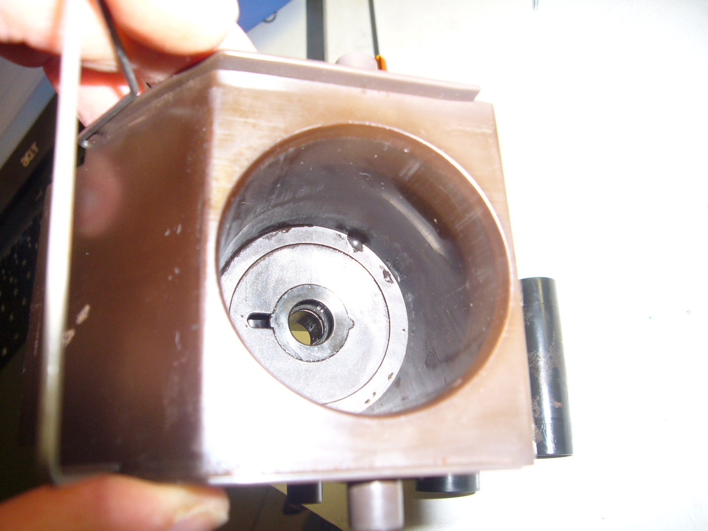 Beim Versuch einen Kaffee zu beziehen knarzte die Maschine, rumpelte, es kam kein Kaffee, das Kaffeepulver wurde trocken ausgeworfen und die Maschine blieb mit blinkendem Display stehen. Mit viel Mühe habe ich die Brüheinheit herausbekommen. Dabei ist mir aufgefallen, das mit dem Antrieb etwas nicht stimmt. Habe ihn zerlegt und festgestellt, dass die Dekoderscheibe auf der Welle verdreht war. Habe die Scheibe wieder richtig aufgesetzt und festgeklebt.