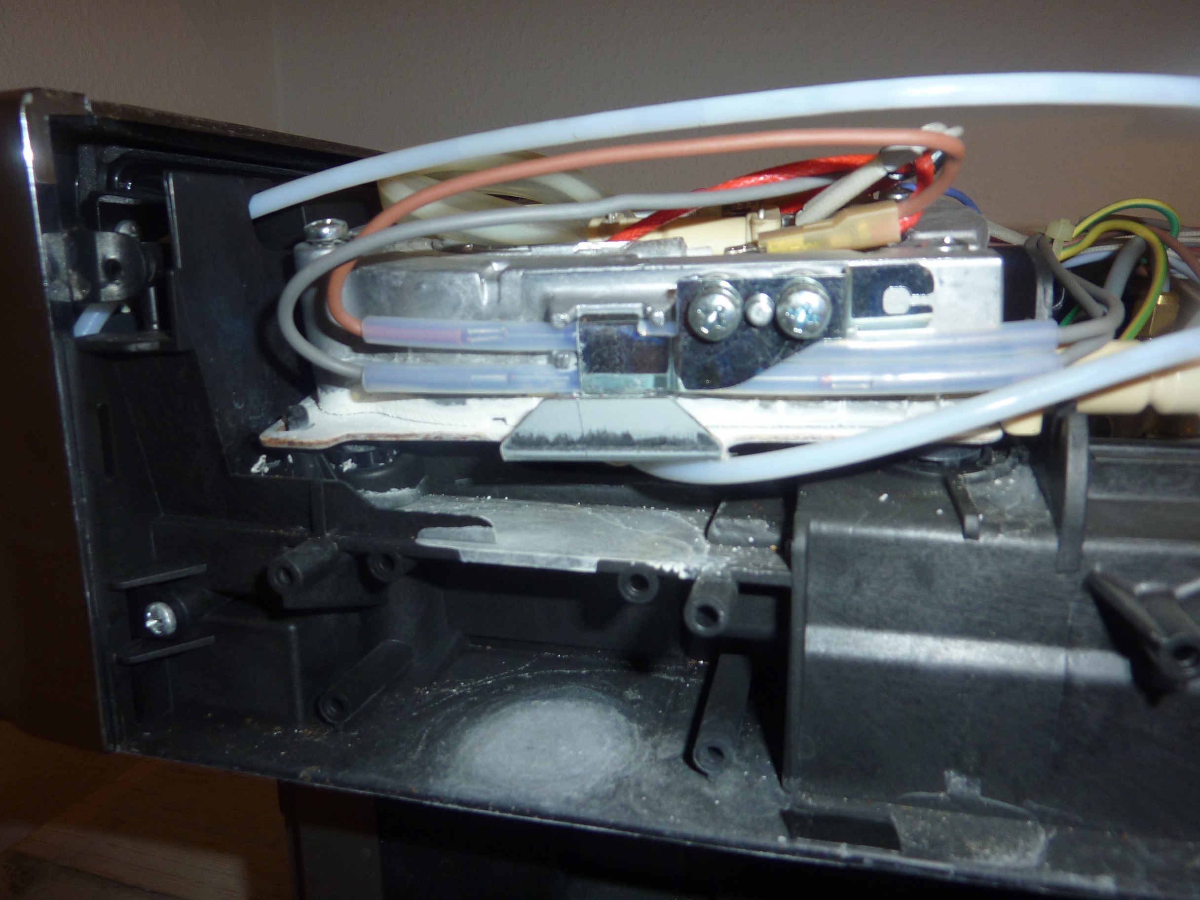 Ich habe nun das Gehäuse nun geöffnet. Unter dem Boiler kann man eindeutig erkennen, dass Wasser ausgetreten ist (Kalkablagerung).