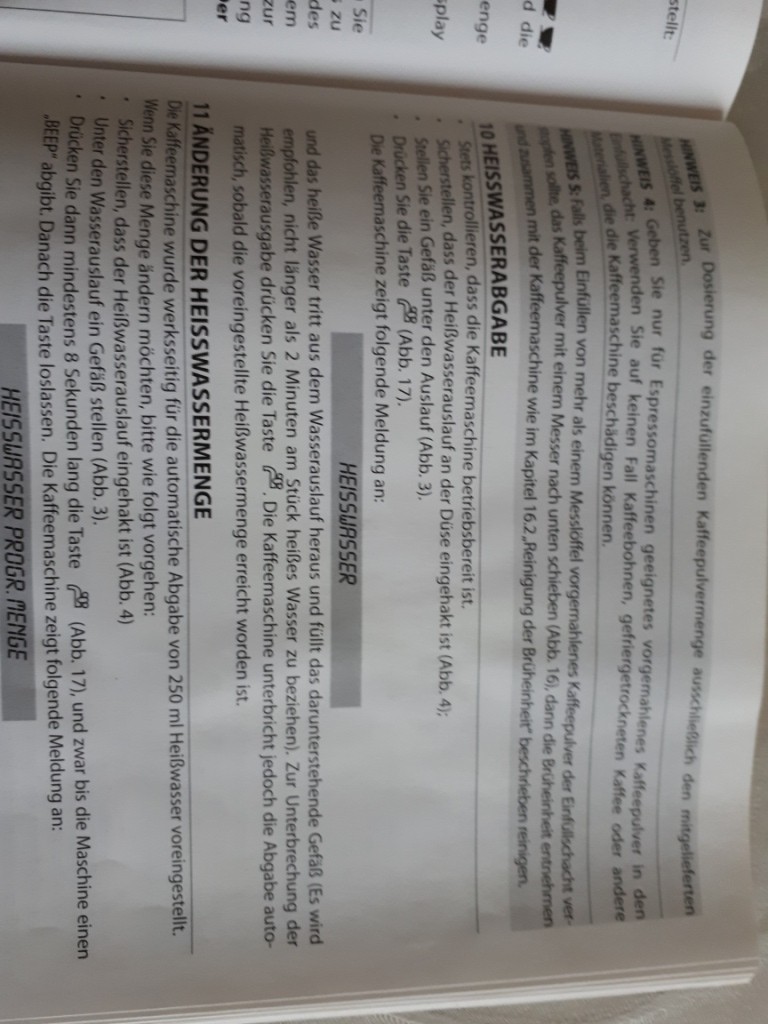 Wenn die Funktion Heißwasserbezug angesteuert wird (siehe Foto aus Handbuch anbei), dann kommt auch bei dem Versuch der Anwahl von Milchschaum oder Caffe Latte, Cappucino oder auch Latte Macchiato nur die Meldung "Aufheizvorgang, Bitte Warten". Dann geht die Maschine ohne Aktion in den normalen Betriebsmodus über.