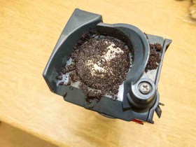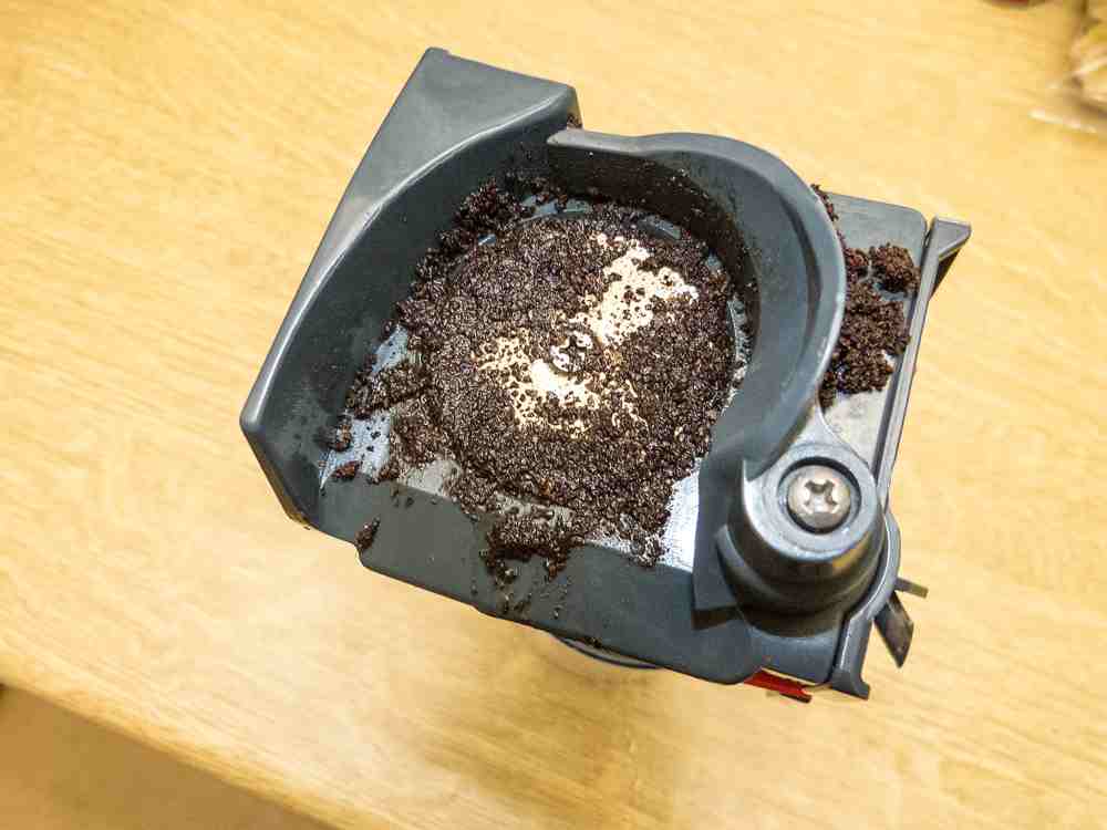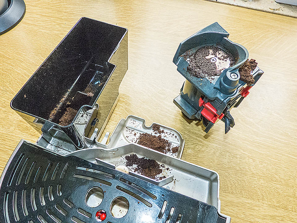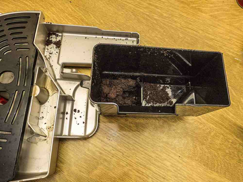 Auf der Brühgruppe scheint der Kaffeesatz eher klatschnass, im Auffangbehälter eher trocken zu sein. - Merkwürdig.